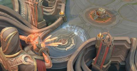 蓝方高地:在新王者峡谷中,大唐军队将上古机关的核心搬到蓝方高地,在华美而威严的凤鸟雕塑下,对它进行再开采并投入使用,建立了“大唐机关要塞“(蓝方出生点)。神秘的上古机关术透过一组组齿轮驱动着”大唐机关枢纽“(蓝方基地)和”大唐机关防御塔“(蓝方防御塔)