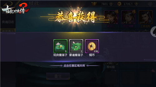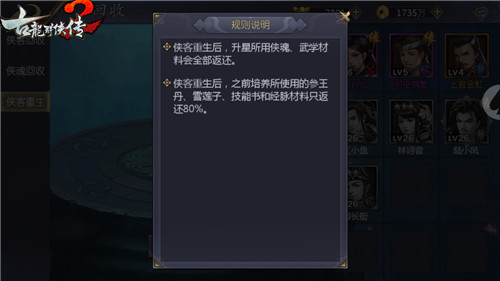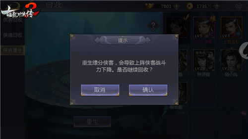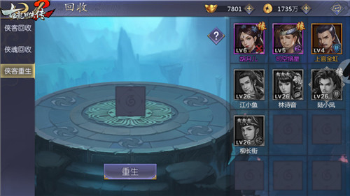 【重生】系统设在回收功能里,在侠客重生界面中,可重生侠客在右侧栏会一一显示,而上阵侠客则需要下阵之后才能进行重生操作。