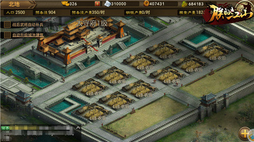 相对同款三国材题游戏《朕的江山》在内政系统上做了极大的改变,玩家无需再烦琐的去升级。极简的内政系统,玩家只需在城池中建府、种地、开市集,给予足够的提升即可。操作简便了许多,然而却夹着很多战略意义,每个城池只有固定10个位置建立基地,针对不同地理位置的城池建立不同的基地,意味着不同的战略打法。比如每个城池只建一种基地,方便集中资源迅速扩张,但一旦该类型城池被攻占后,会造成资源断裂。又或许每个城池均匀建设,便于稳定资源,但资源获取速度相对较慢,扩张起来也比较困难。