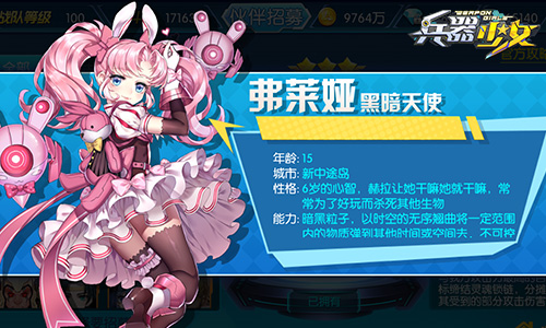 黑暗天使弗莱娅,在100级新版本中首先登场的8星英雄伙伴。布偶洋娃娃、粉色公主裙,再配上粉色双马尾,弗莱娅怎么看都是一位天真可爱的少女,但是这位15岁的少女却是MBA人形兵器科技的最高体现,掌握许多神奇的能力。仅仅只有6岁心智的她,常常为了好玩而杀死其他生物,被称作可怕的黑暗天使!