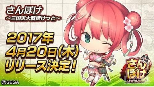 SEGA今日在官方Twitter上宣布,改编自人气街机游戏作品《三国志大战》的手游新作《三国志大战口袋版(さんぽけ ~三国志大戦ぽけっと~)》(iOS/Android)确认于4月20日正式发售,而且在发售后还会和《真三国无双 7 with 猛将传》展开合作活动。