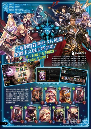 《影之诗(Shadowverse)》原本是日本游戏开发商Cygames开发的卡牌游戏,游戏除了拥有出色的人物设计外,卡牌的玩法与《炉石传说》相似,游戏在上线后获得了不错的评价,但一直没有中文。日前,Cygames台湾宣布,将推出官方繁体中文版本,中文版定名为《暗影诗章》,预计将会在2017年上市。