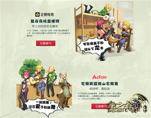 其中,神圣天堂时装征集大赛在4月7日至4月30举行,游戏特别联合了“有妖气”漫画,邀请各路高校设计师尽情展现设计天赋。而偕同“企鹅电竞”共同打造的基谷高校直播周亦将不日开启,有主播才能的玩家届时可以带上舍友一同屠龙,一边下本一边闹!此外,《龙之谷手游》与ACFUN视频(A站)也推出了宅舞联萌猴山宅舞赛,小姐姐们需要根据游戏主题舞曲《一起来冒险》改编创作,投稿至A站即可参与。独属于谷迷们的冒险舞台,也将让玩家们的青春大放异彩!名列前茅者更可以摘得丰厚福利,用奖励为自己的青春戴上桂冠!
