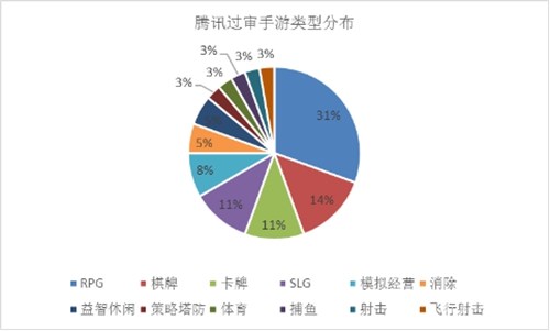 截止2017年3月,腾讯旗下共有36款手游获得版号,类型分布上,RPG占比31%,很符合当下的市场状况。排在第2的是棋牌,腾讯本就有休闲游戏DNA,棋牌则是用户渗透率最高的类型。总的来看,腾讯过审手游类型丰富,且比例分布较为平缓。