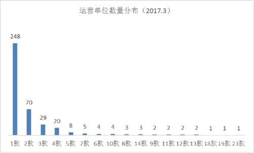 过审手游款数与对应运营单位数量呈负相关关系,从图中可看出两极分化较为明显。仅有1款手游获得版号的运营单位多达248家。当然,从TOP榜单来看,还有不少我们熟知的业界翘楚并未亮相,说明数量只是业务的衡量标准之一,游戏品质更为重要。