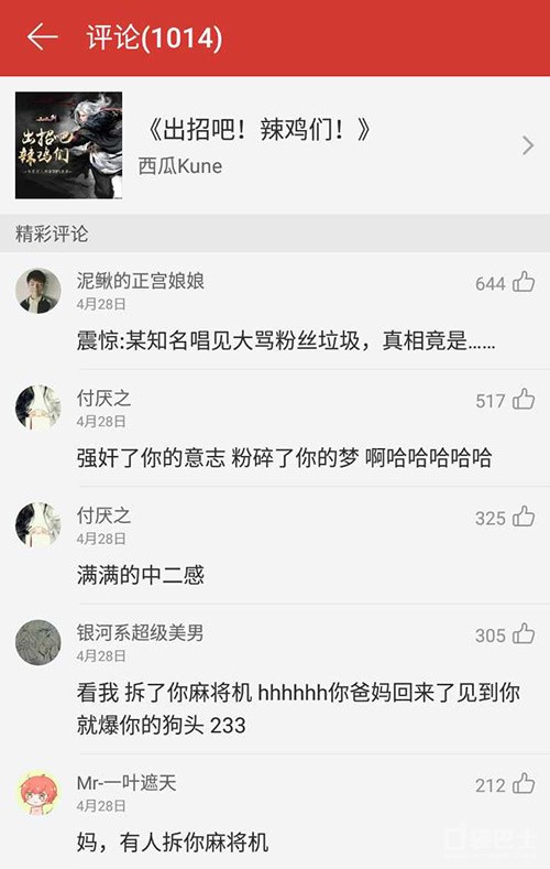 截止目前,《三少爷的剑》武侠神曲MV《出招吧,辣鸡们》在网易云音乐的乐评数量早已突破“999”。 世间神乐评千千万,云音乐评论区占一半。层出不穷的神评论,直令人忍俊不禁,不得不感叹主唱西瓜Kune的非凡魅力,同时也印证了神曲的“怼人”功力名不虚传。