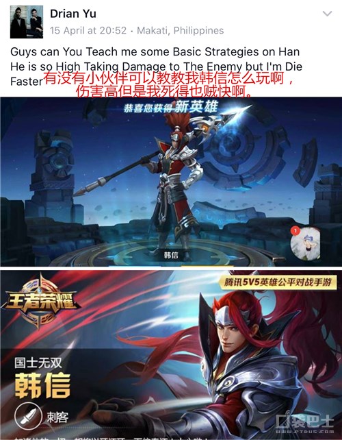 翻译:有没有小伙伴可以教教我韩信怎么玩啊,伤害高但是我死得也贼快啊。