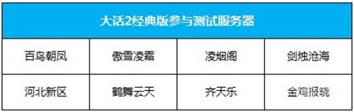 《大话西游2经典版》共有以下8台服务器参与本次口袋版稳定性测试:[百鸟朝凤]、[傲雪凌霜]、[凌烟阁]、[剑烛沧海]、[河北新区]、[鹤舞云天]、[齐天乐]、[金鸡报晓]。测试期间,以上8台测试服务器的所有安卓玩家均可通过官网、论坛、微信公众号等渠道直接下载口袋版安装包,安装游戏参与测试。