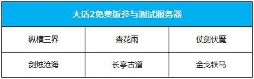 《大话西游2免费版》共有以下6台服务器参与本次口袋版稳定性测试:[纵横三界]、[杏花雨]、[仗剑伏魔]、[剑烛沧海]、[长亭古道]、[金戈铁马]。测试期间,以上6台测试服务器的所有安卓玩家均可通过官网、论坛、微信公众号等渠道直接下载口袋版安装包,安装游戏参与测试。