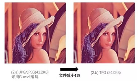 在同等质量的前提下,TPG与JPG/JPEG、PNG、GIF、WEBP等不同图片格式进行对比,TPG的文件大小最小,TPG比PNG小50%以上,比GIF小90%以上,比JPG/JPEG格式图片(采用Libjpeg-Turbo编码)可以小40%以上,比采用Guetzli编码的JPG/JPEG格式则能够小41.7%。相对Google推出的 WEBP格式,文件大小可以减少近30%。在保证同样的清晰度的前提下,TPG图片格式普遍小于其他格式。
