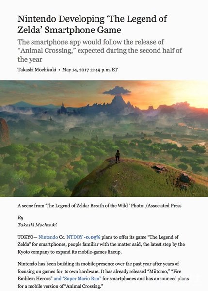 据华尔街日报(Wall Street Journal )网络版报道,任天堂或将推出《塞尔达传说》手游。文章指出,任天堂计划为智能手机推出“塞尔达传说”系列手游,而据知情人士称,这一计划由任天堂位于京都的公司主导,继续扩展其游戏阵容。