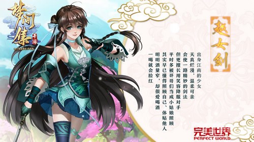 《梦间集》中的越女剑年纪虽小,却很懂得照顾人,脸上总是带着治愈的微笑。越女剑的服饰以碧色为主色,让人联想到濛濛细雨的江南水乡。如水的长发、纤细的身材和天真烂漫的笑容也尽显江南女子的婉约美好。相传早在春秋吴越争霸时,越国因为士兵得到一位美貌女子传授精妙剑法,才打败了吴国成为霸主。