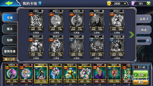 每个游戏的角色会拥有多个卡组,切换角色的时候回展示对应角色已经保存的卡组。而在自己的卡组中,卡牌又被分为“怪兽”、“魔法”、“陷阱”和“蕾雅怪兽”四种类型。在每个角色的卡组中,又有一部分卡牌被称为“核心卡牌”。