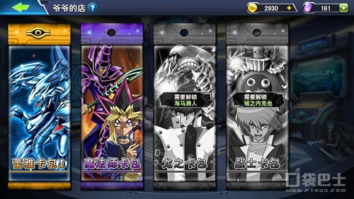 玩家可以在“爷爷的店”里购买卡牌。目前共有四组卡包,分别是蕾雅卡包I、魔法师卡包(解锁武藤游戏后获得)、龙之卡包(解锁海马濑人后获得)、战士卡包(解锁城之内克也后获得)。