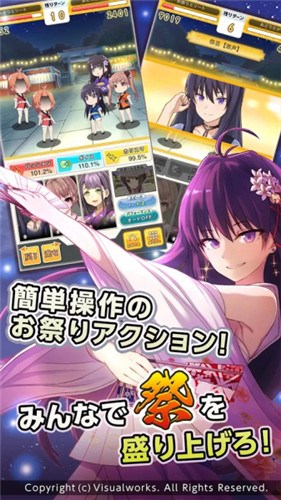 《尽情畅舞~少女们在祭典中尽情跳舞吧~》是Visualworks发布的一款节奏动作游戏。本作难度比较简单,玩家轻松上手。游戏里玩家可以选择不同性格属性的美少女跳舞战斗,并且还有着众多的服饰和角色等你收集,先已经双平台上线,快来一起跳舞吧!