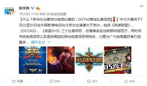 昨日中午,新华网官方微博正式对外公布将要举办电子竞赛的消息。据悉本次“新华电子竞技大赛”将在7月22-23日,中国教育电视台北京亦庄演播大厅举行,并且还准备了总额超过百万的奖金。本次赛事的主要项目包括《DOTA2》《英雄联盟》以及《街篮3V3》。