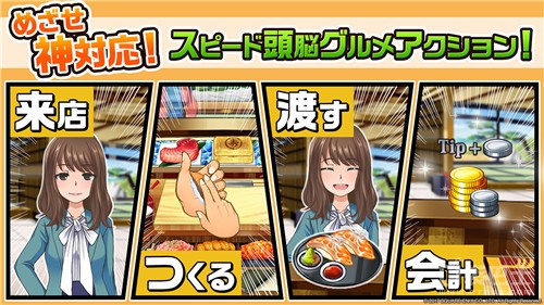 在游戏中有一张大地图,地图上时各种各样菜系的店铺,比如日系料理,中华料理,海鲜,烧烤,快餐汉堡等等。