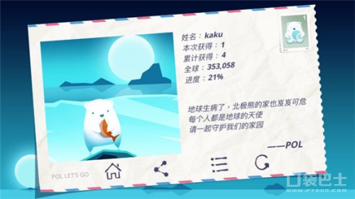 北极不属于任何一个国家,但是却需要全世界人民一起来保护。游戏内的另外一个目标,就是收集73亿个冰晶,每个玩家收集到的冰晶都可以帮助北极一点一点恢复到原来的面貌,你还可以在主界面感受到变化。并且收集冰晶最多的国家,还会显示在主界面哦!