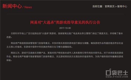 30号晚上,网易《终结者2:审判日》官方发表了名为“网易对大逃杀类游戏指导意见的执行”公告,其中网易表示日前针对市场上广泛引起热度的“大逃杀”类游戏,国家新闻出版广电总局业务主管部门表达了高度的关注,并且明确了基本态度。而网易也将严格按照国家管理部门的指导意见,尽快堆相关类型的游戏进行修改和调整,确保游戏作品传递的理念符合社会主义核心价值观,在游戏中倡导中华民族的传统文化习惯与道德规范。