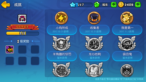 通过点击主界面左侧中成就按钮,即可进入成就系统进行查看。成就系统见证着玩家在蘑菇岛中点点滴滴,覆盖十分全面,多种成就均为同时挑战,如角色同时达成“我是第一”与“吸血鬼”两个成就,则两者同事进行。因此,仔细查看每个成就达成的条件,把能够同时进行的成就同时完成,就能尽快达到更多的成就哦!