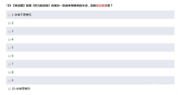 腾讯每要推出一款IP或大热类型的游戏前都会给用户发来一份调查问卷,根据用户的反馈来调整游戏内容。日前腾讯就给QQ用户发出了最新一份问卷,关键字直指“手游”、“权力的游戏”、“战争策略类游戏”,明显是想要推出《权力的游戏》手游。然而据早前消息,国内拿下“权力的游戏”这个IP的是游族网络,腾讯应该只是担任发行这一角色。