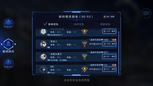 为了提升对战质量、保证游戏体验,像小编这种普通玩家可以消费金币招募强力队友进行游戏。在雇佣界面,佣兵们的身价、胜率一目了然,大家可以根据自己的需求直接雇佣游戏大神,这次再也不用担心被坑喽。