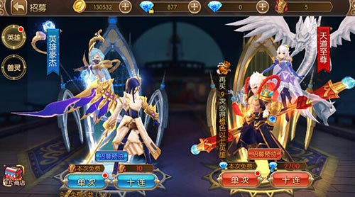 《吞天记》之中的“英雄招募”玩法,包括普通招募以及高级招募两种,其中普通招募消耗“招募令”这一特殊道具,不过每日都有5次免费的招募次数。高级招募则需要消耗钻石,每24小时可以获得一次免费的招募次数。普通招募以及高级招募均包括单次招募和十连招募,其中十连招募更高概率获得高品质英雄。
