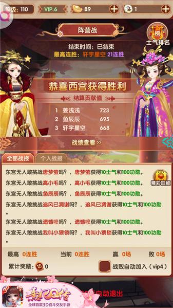 在每位小主的战斗过程中,都可以为自己的阵营增加士气,同时自己也将获得功勋值。当然了,精彩的对决还需细细品味,在战斗结束之后小主们依然可以回顾和分享激战过程,仰望一下大神们的红将队列,或是学习一下出奇制胜的随从阵容,何乐不为?小主们自己的个人战况也将在游戏中贴心地完整显示,赢在哪里输在何处,统统一清二楚,为自己的宫斗力提升提供一条高速捷径!