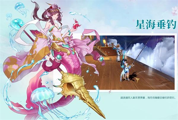 探索未知的宝藏永远能令人充满动力,全新双人副本“星海之舟”不仅蕴藏着无尽的宝藏,还能让玩家在探宝的同时饱览迷人天空之境。玩家购买“星海船票”进入副本,可随机钓到宝袋等道具和废品,运气爆棚的玩家还能钓到珍稀坐骑“密棘鮟鱇”、“龙凤锦鲤”,钓到星海神兽并击杀可获得最终奖励。快来和好友一起赏美景、拼人品吧!