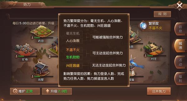 点击合并势力按钮,可以查看势力的当前繁荣度和合并状态,并进行主动合并的申请与接收操作。当势力繁荣度很低时,势力可能被强制合并。势力繁荣度与势力登录人数、完成势力任务人数、势力频道发言人数有关,所以请在势力的各位多多活跃哦!