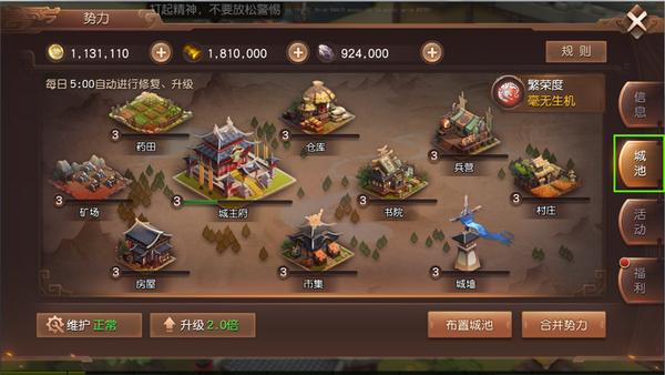 成功夺城之后,玩家就有属于自己势力的城池了。城主回到势力场景后,可以点击布置城池按钮对势力城池中建筑进行布置。每个城池都有以下建筑:城主府、仓库、市集、兵营、房屋、书院、村庄、矿场、药田、城墙。点击建筑,即可查看该建筑的信息。