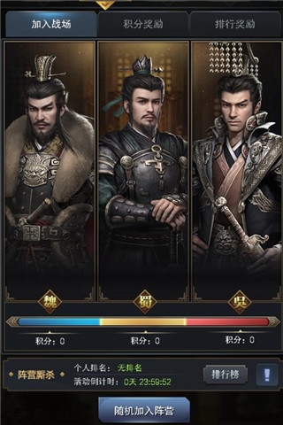 主公们随机加入魏蜀吴三个阵营其中一个,攻击其他阵营的建筑,可以获得分数。奖励设置个人奖励跟团体奖励,个人奖励达到分数阶段便可领取,达到领取上限之后便不能领取奖励,但是继续击杀敌军阵营可以为自己阵营增加分数,也可以减少敌军的分数,保证自己的阵营分数保持在第一。阵营的总分是所有该阵营主公们所有分数的总和。