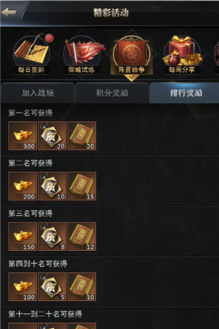 活动结束时,根据三方排行榜分数总和进行比较,获得较高积分的阵营获得胜利。若有两方积分相同情况下,先达到该积分的一方阵营获胜。总分第一的阵营,阵营中的每位有积分的玩家都可以获得粮草、银两、铁矿各20万,而各阵营中积分排名前50名的玩家有元宝、招募令、天赋经验等奖励,个人阶段分数也是有少量资源跟天赋经验奖励。
