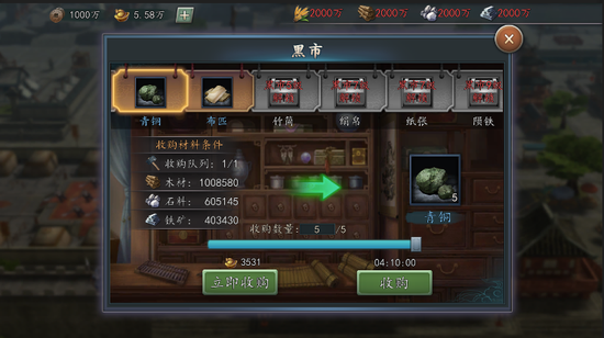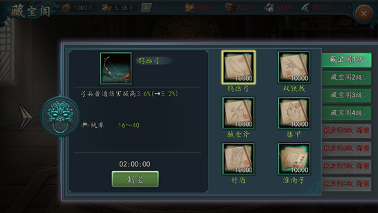 3)提升藏宝阁建筑等级,可解锁更多的宝物制作,制作宝物,需要花费时间、宝物图纸、材料,玩家可以通过挑战名将副本,获得宝物图纸,同时通过黑市收购材料,此外,提升黑市等级,可解锁新的可收购材料;