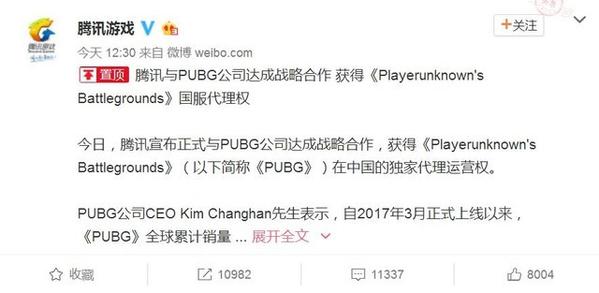 腾讯22日午间正式宣布与PUBG制作公司—— 韩国Bluehole达成战略合作,获得《Playerunknown's Battlegrounds》(《绝地求生》)在中国的独家代理运营权。