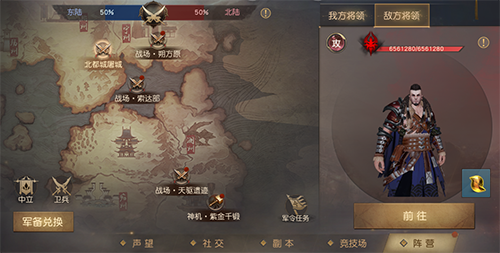 在战场·朔方原玩法中,深入敌营、木场争锋、争夺俘虏和巡逻卫兵等任务等待着双方阵营的玩家去完成,这些任务的完成程度关系到双方的基地建设度,还会引发战场资源的抢夺。