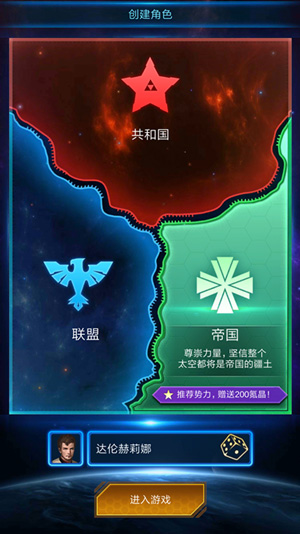 玩家进入游戏,先得搞定角色系统的角色创建三大步。首先就是选择效忠的势力。游戏中共分布着三大势力:共和国、联盟以及帝国。为了引导天赋异禀的指挥官加入自己的战队,三大势力也使出浑身解数,不仅对势力情况做了详细介绍,某一势力还会祭出“氪晶的诱惑”:玩家如果选择了该势力,将在进入游戏时获得200氪晶奖励,这在游戏初期可是笔不小的财富哦。