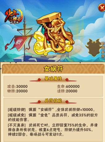 与伏羲符一同出场的是“复活神器”女娲符,它能够让武将在死亡时瞬间恢复绝大部分血量,该技能相当于为武将附加了第二条生命,同时还能提升高百分比的防御加成,并增加数点怒气,可让武将死而后生,愈战愈勇。