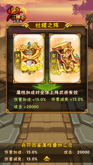 此外,玩家们在拥有伏羲符和女娲符两个金色兵符后,可以激活“社稷之阵”图鉴,提升全体武将的伤害加成与减免,并额外为全体上阵武将增加攻击力,加强武将的输出能力。