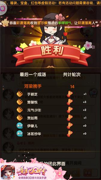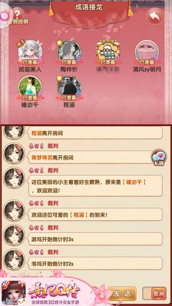 宫斗关卡通过80关的小主们,只需打开《熹妃Q传》的宫斗主界面,点击“跨服频道”—“频道列表”—“游戏频道”—“成语接龙”,就可随机加入或自主创建一个游戏房间并邀请熟识的小主一起参加游戏了。