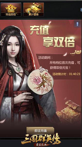 《三国群英传-霸王之业》手游公测盛典,以“天天降福利,红包领不停”、“元宝充值,双倍返利”两大活动为契机,准备了大量元宝犒劳广大玩家。活动期间,玩家每日在固定时间段(12:30-13:30/17:30-18:30/20:30-21:00),各有1次抽红包机会,100%获取一定数额元宝——单笔奖励至高888元宝,最少也有28元宝,真金白银的福利玩家怎能错过?