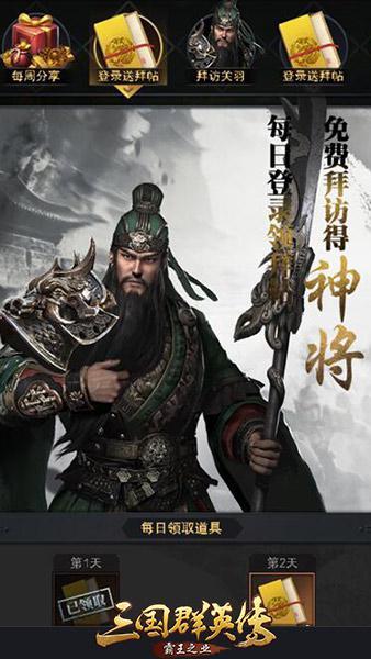 《三国群英传-霸王之业》手游公测盛典期间,玩家参与拜访武将活动,就有机会获得橙色武将关羽。让人惊喜的是,即便玩家无法成功把关羽招致靡下,也能100%获得大量的奖励。奖励包括海量的资源、加速道具、兵书、主城装扮碎片(7天)等道具,加速玩家发展之余,更能让主城装扮焕然一新。