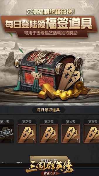 《三国群英传-霸王之业》手游公测盛典期间,玩家每天通过体验不同的游戏内容即可获取因缘值,用于领取抽奖券和抽取奖励。同时,玩家在活动期间累计获得一定因缘值后,可在活动界面领取丰厚奖励。该活动划分为“每日活跃”和“累计活跃”两个环节,前者为抽奖形式,活跃度每日清零,奖励包括天赋书、战鼓、元宝、招募令等海量游戏道具,100%中奖;后者为领奖形式,活跃度不清零,奖励包括皮肤、铭牌、橙马、粮草50W、银两50W等奖励,满足条件即可直接领取。