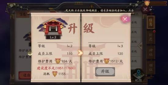 寮成员完成每日集体任务,便可提升阴阳寮建设度,帮助阴阳寮获得升级资格;获得升级资格后,会长可花费一定的阴阳寮勋章进行升级,阴阳寮升级后便可容纳更多成员,同时解锁更多福利。
