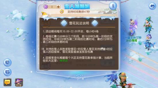 在雪人蹦蹦跳活动时间,每15分钟会进行一轮比赛,每一轮比赛共分为3个阶段。其中前10分钟是支持阶段,玩家可以随意用雪花支持自己喜爱的雪人,而中间3分钟为比赛时间。在比赛期间,玩家可以点击其余未支持的雪人,使用香蕉、石子、栅栏等物品,干扰和拦截它们,从而降低它们的速度,提高自己支持雪人的胜利机会!也许你的一份小小力量,就能够让你所支持的雪人赢到最后!