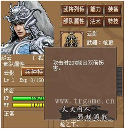 变更赵云(云影)特技远距离防御40%变更为20%双倍攻击