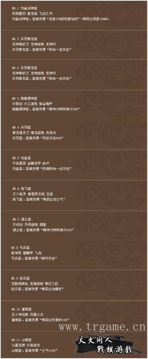 新增关羽(青龙)套装,简雍(酒神)套装,刘备,关羽,张飞,赵云,谋士,富商,弓兵,山贼套装效果如下