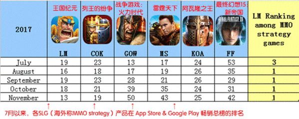 几款主要的SLG手游在全球市场的表现