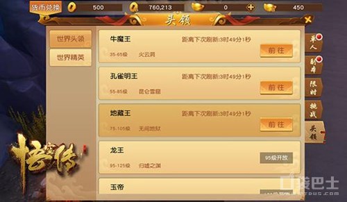 目前,游戏中根据仙友等级开放了不同的世界首领,每个等级段的世界首领每天在固定时间刷新,仙友们可以提前进入地图,做好作战准备,具体刷新时间可以在《悟空传》【每日必做】中了解。参与世界首领PK的仙友,会根据对首领造成的伤害发放对应的奖励,开启奖励宝箱还有机会获得稀有橙装或红装。