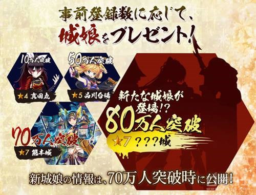 随着手游版的曝光,游戏的事前登录活动也已开启,官方将根据登陆人数直接赠送玩家各个星级的城娘,突破70万和80万人时,更有游戏中顶级7星城娘放送!对此,玩家的响应也是相当热烈,事前登录人数首日便已突破16万人。